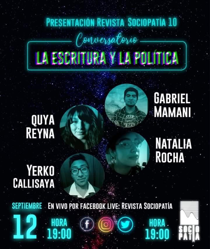 La revista Sociopatía celebrará sus cinco años con un conversatorio sobre escritura y política. Esta actividad será transmitida en vivo desde su página de Facebook (https://bit.ly/2F94xPa) el sábado a las 19:00.